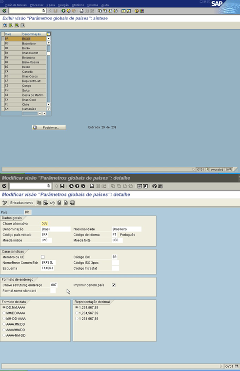 IMG → Opções gerais → Definir países → Definir países em sistemas R/3